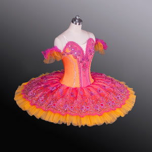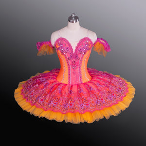 The professional, platter 10 layers tulle skirt is a triumph of orange, hot pink and purple. The sparkle that you see here on the tutu skirt will only be magnified ten times over under stage lighting. This amazing costume design is an outstanding ensemble for the Firebird role.