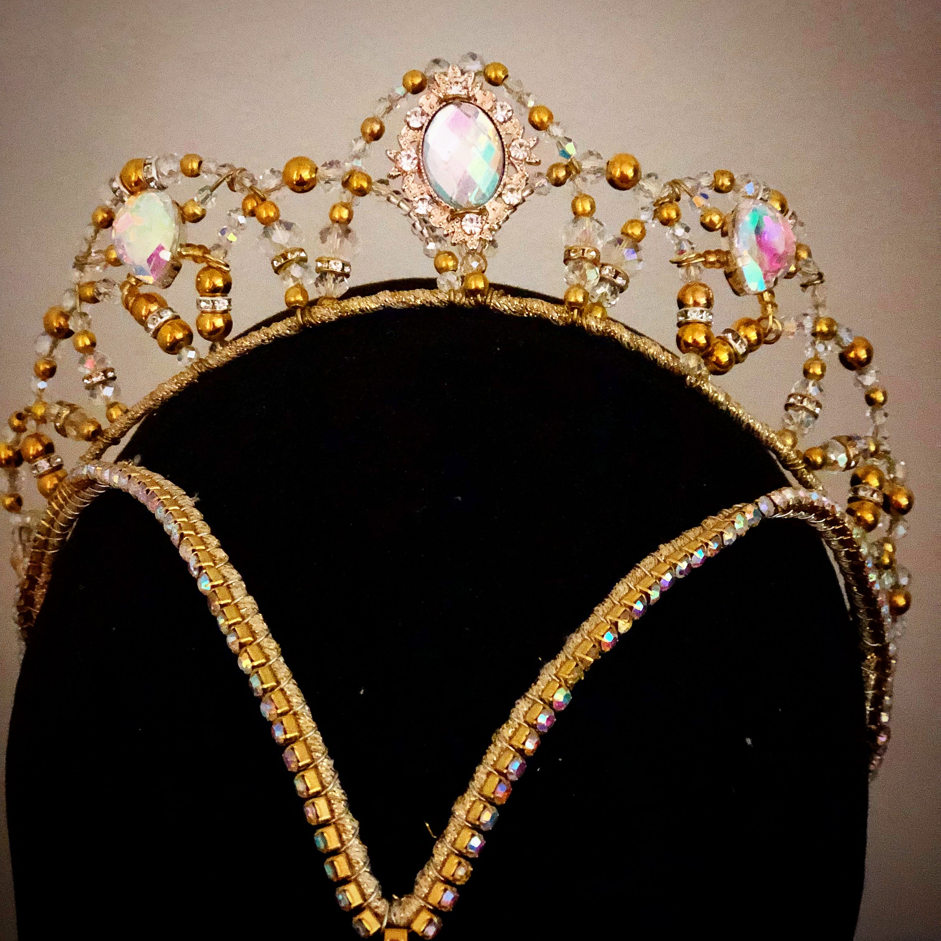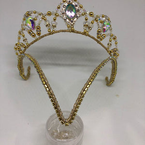 This headpiece is entirely hand wired, and features a golden frame crown with clear Swarovski crystals. There is a trinagular section attached to the crown, that comes onto the forehead of the ballerina in a triumph of clear rhinestones.