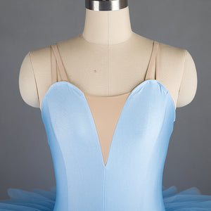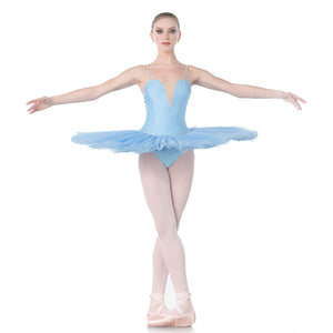 The tutu is created on the model of a fully professional tutu. The bodice is made in high quality lycra and features a nude V insert in the front, and clear elastic straps.