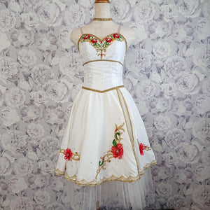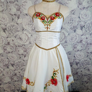 This costume is made with ivory, high quality silk satin, following the original design for this ballet. The top part of the costume features rich gold trim decorations, red flower appliques, green sequins and crystals.