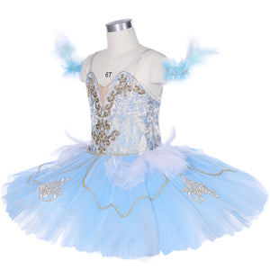 Princess Florina (The Blue Bird) child professional tutu. The paneled bodice is created with pale blue and gold brocade fabric and features a charming V-cut in the front and a nude inset. Decoration features appliques and trims, as well as gems. Very feminine little blue sleeves with blue feathers are included with this costume..