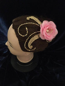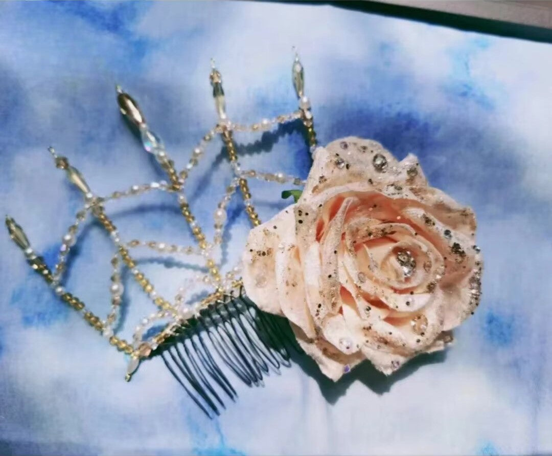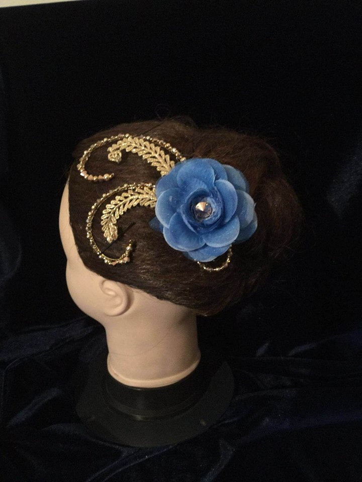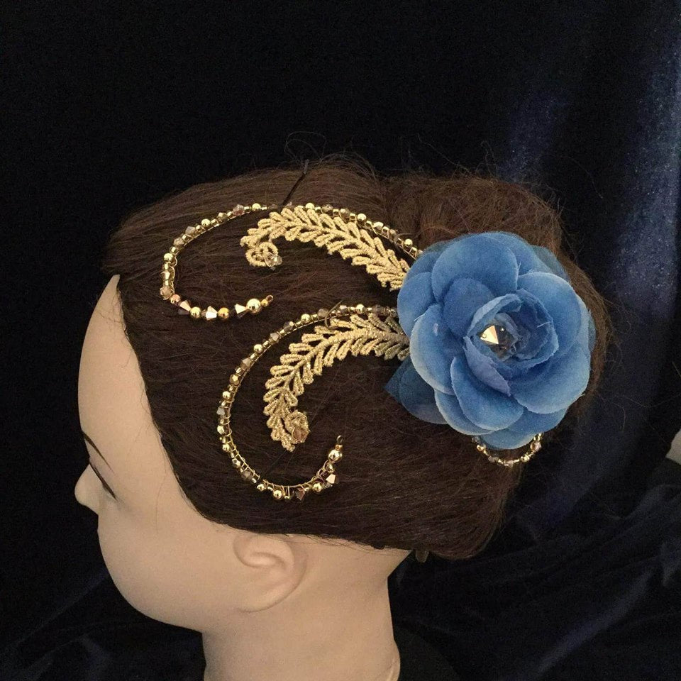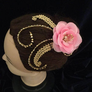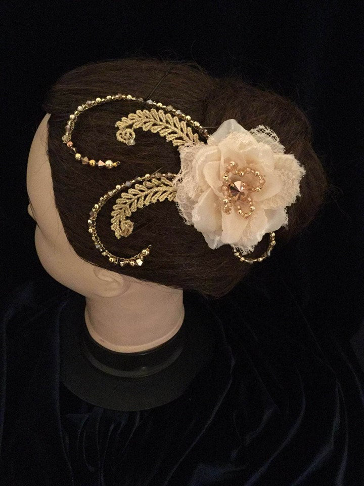 A new, very impressive creation! This gold headpiece with a silk, pale peach rose, can be used for many classical ballets: Waltz of the Flowers, Don Quixote, Paquita, Corsaire Le Jardin Anime', Esmeralda Grand Pas des Fleurs and many other ballets.