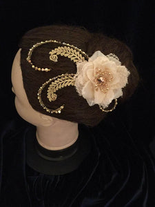 Entirely hand made, this lateral headpiece is made with a golden frame and features a beautiful silk flower decorated with beads on the inside, and an elegant golden comb decorated with small pearls and sparkles.