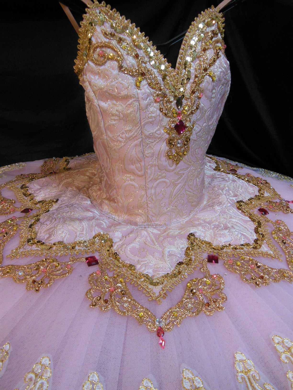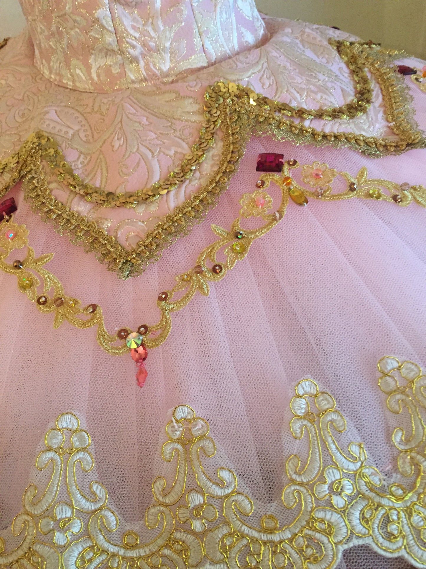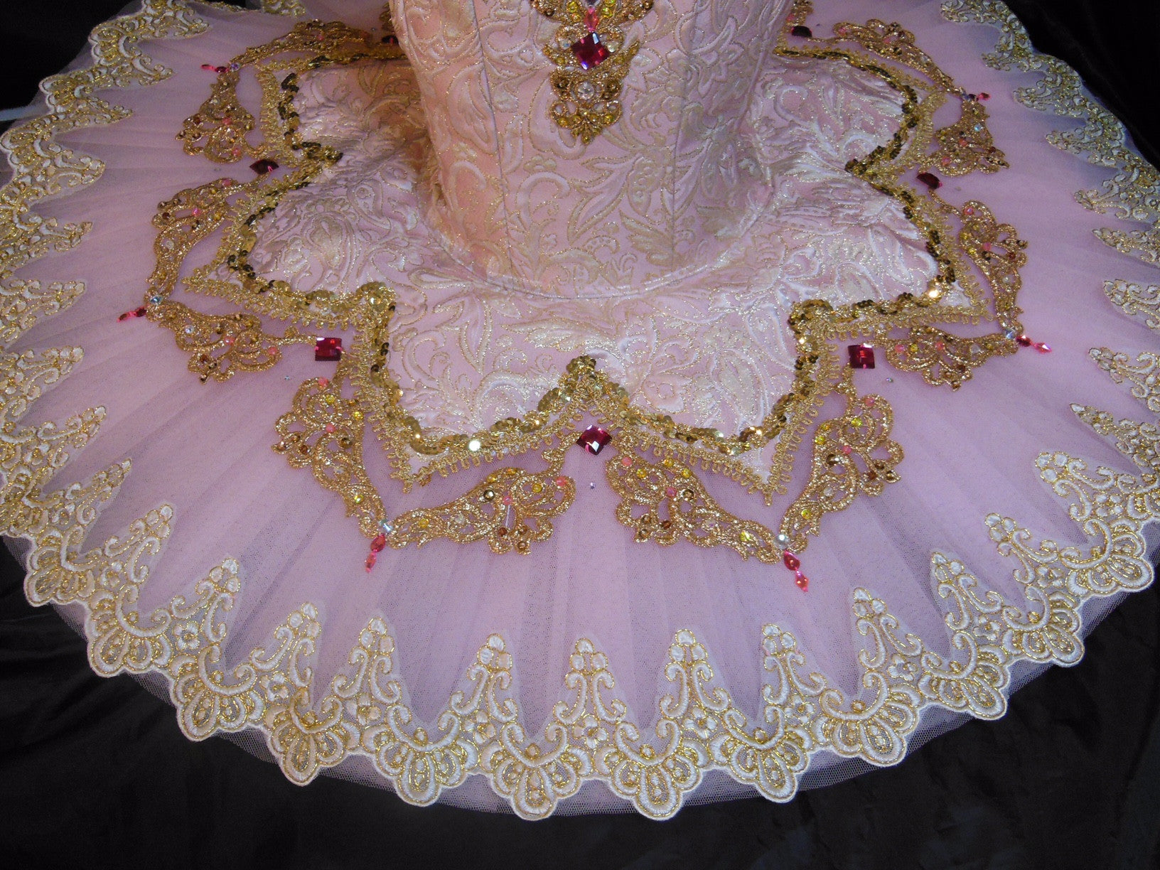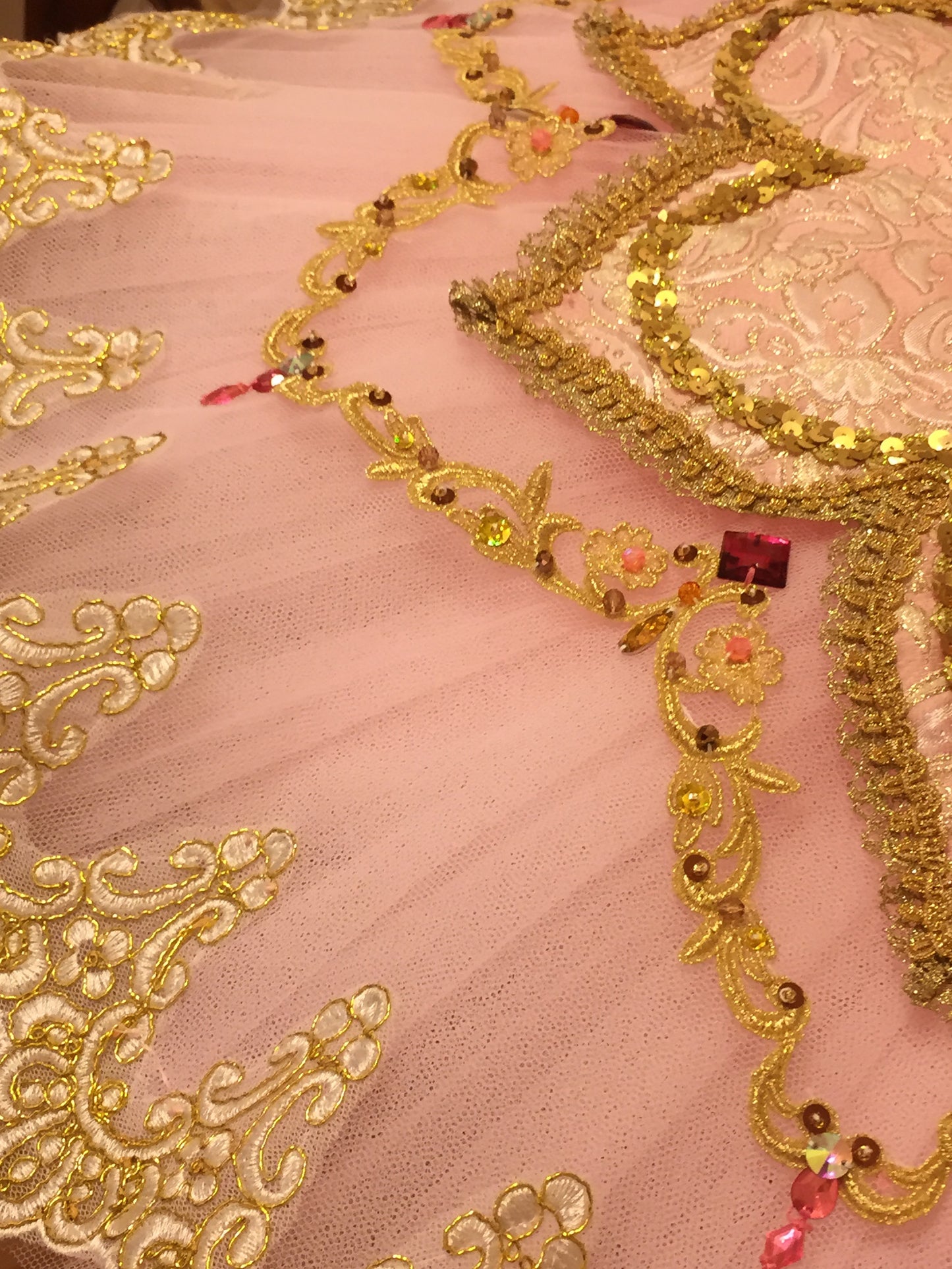 The pale pink  professional skirt features a small pink brocade overlay richly and lavishly decorated with all sorts of trims, appliques, sequins and red beads. Each layer of the skirt is tacked so that the costume moves as one with the dancer.