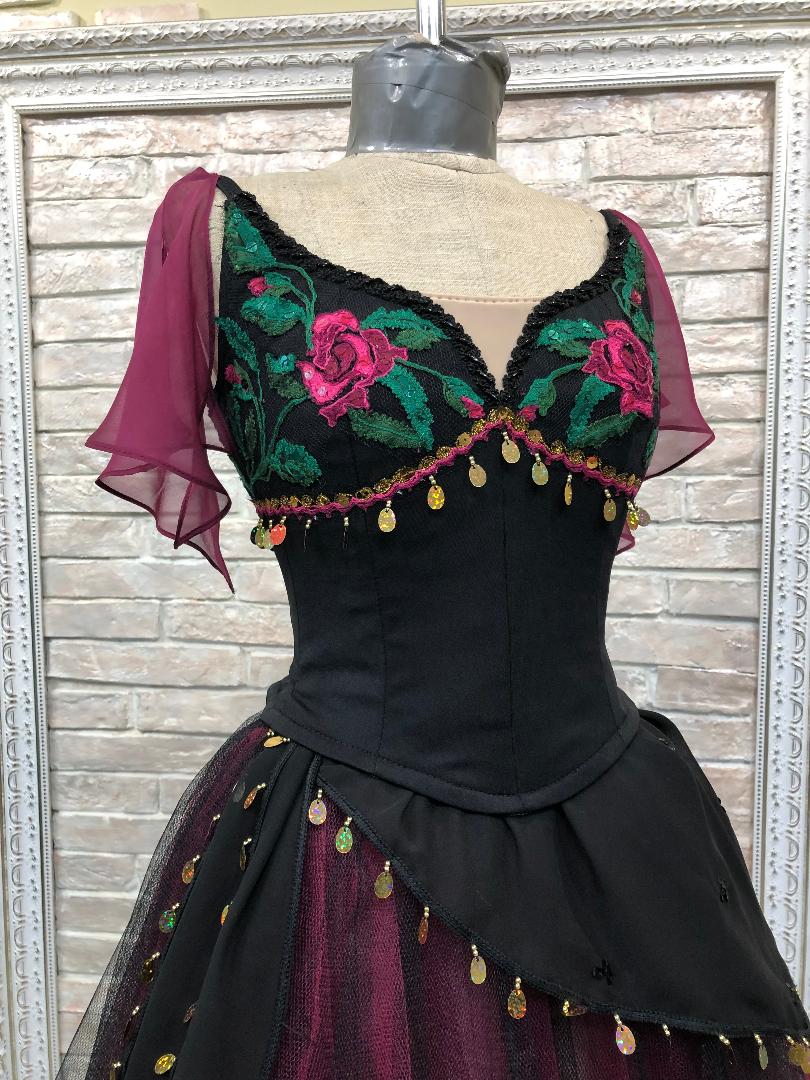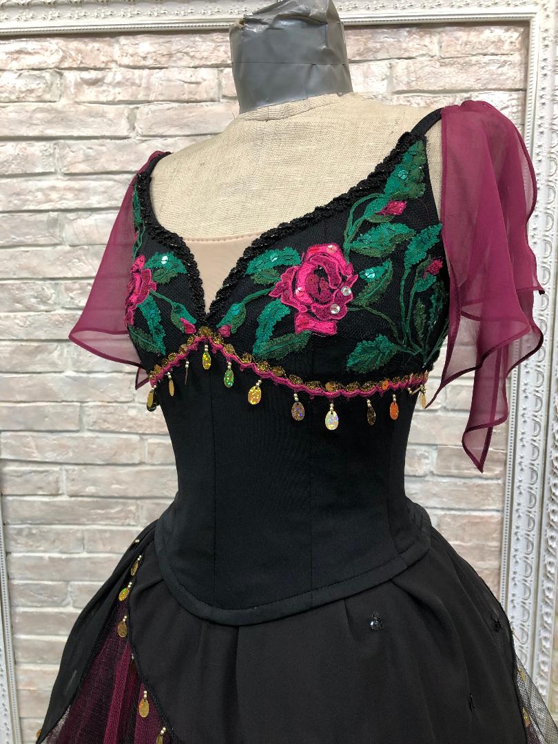 The bodice is made with black semi stretchy, special fabric, and feature the most sophisticated decoration patter, with hot pink flower, and green leaves appliques, sequins, shiny trims and gipsy coins attached under the chest area. This decoration, and the perfect craftmanship, make this costume unique.