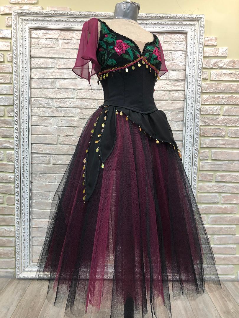 The professional Romantic tutu skirt, has been made using black and deep plum pink tulle, creating an amazing contrast. A black scarf is sewn around the waist, according to the Esmeralda gipsy style, and is decorated with golden coins.