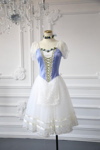 Beautiful Romantic tutu for the role of Giselle or any other Romantic ballet. Sky blue satin bodice with laced pattern and white undershirt. Floral decoration on the round neck. White chiffon short sleeves.