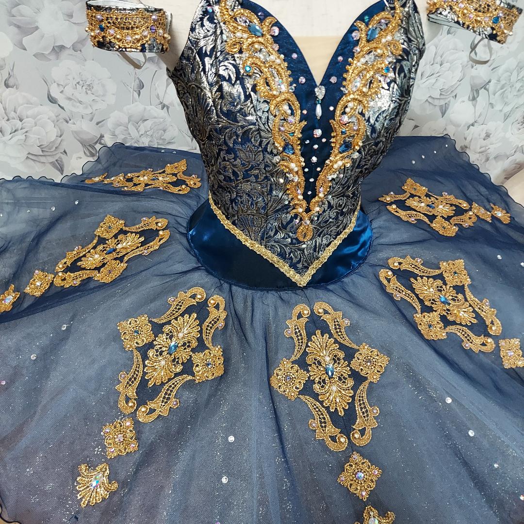 The fitted bodice is made with dark blue satin. There is a deep V cut in the bodice, with a nude insert. Decorations are made with gold appliques, blue, crystals and beads. Black net short sleeves richly complete the look of the bodice. The pancake tutu skirt is created with 12 layers of graded hand dyed tulle in various shades of deep blue. The overlay is made with dark blue organza, and richly embellished with gold and dark blue appliques and trims, beads, white and blue crystals.