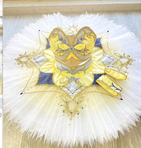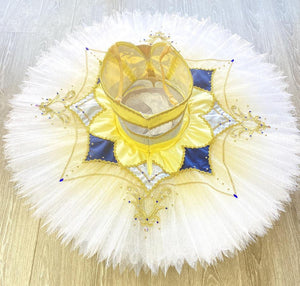 The professional, ten layers tutu skirt features a high waist belt, made with silver and golden yellow satin, and richly decorated as the bodice. The tutu skirt has been ombre' dyed, with fading pale yellow on the upper part, fading to white towards the edges.