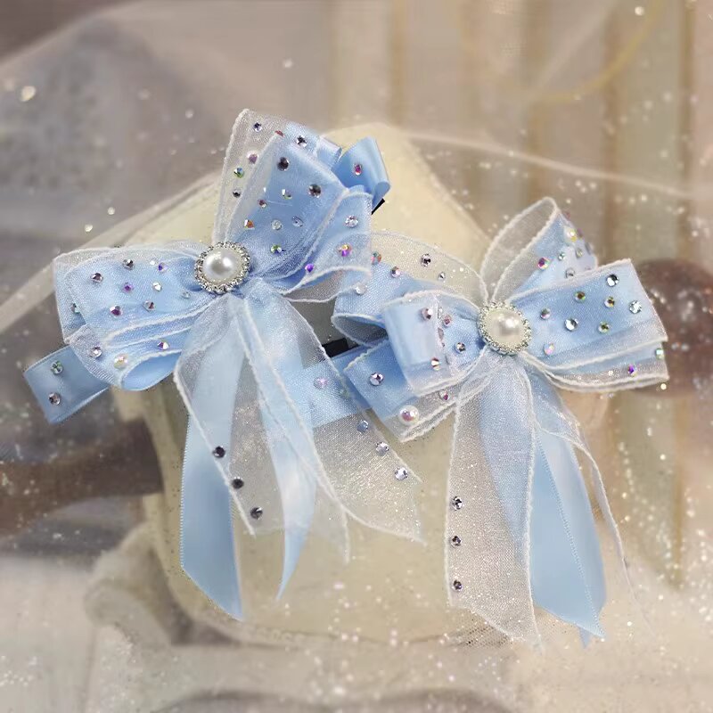 Beautiful silk and organza bows, suitable for the ballet "Graduation Ball", or any other solo. The center of the bows is decorated with a white pearls with small diamonds around, and the top part of the bows is embellished with sparkles.