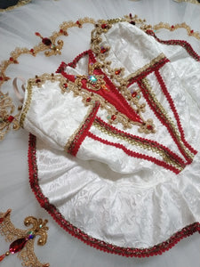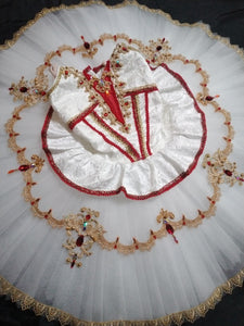 The bodice and the tutu skirt are made with white brocade. The central insert is red, and the whole costume is decorated with gold appliques, red crystals and braids. The costume fastens in the back with hooks and eyes.