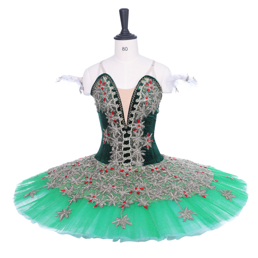 This exclusive tutu is one of our latest creations. The bodice is made with deep, emerald green satin, and features a very pretty, long V cut with a nude insert. The whole V-shaped bodice is embellished with gold trims, and appliques, and crystals. The professional pancake tutu skirt is made with emerald green tulle. The top layer of the skirt is entirely embellished with golden appliques and crystals.,