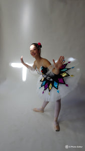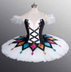 The professional 10 layers skirt features a "Harlequin" overlay in many colors. Arm bands are included.