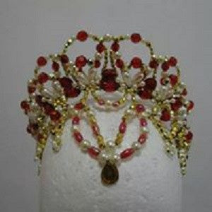 This czarina-type tiara is entirely hand crafted and features a golden base. This crown is decorated with multiple red crystals, and features a big central jewel.