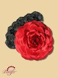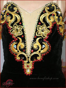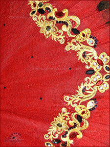 Golden appliqués, bugles, beads, golden, black and red crystals, many holographic sparkles, golden braid are used as décor elements.