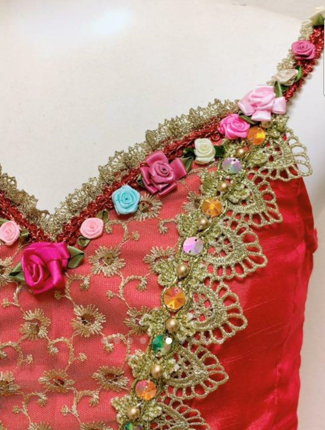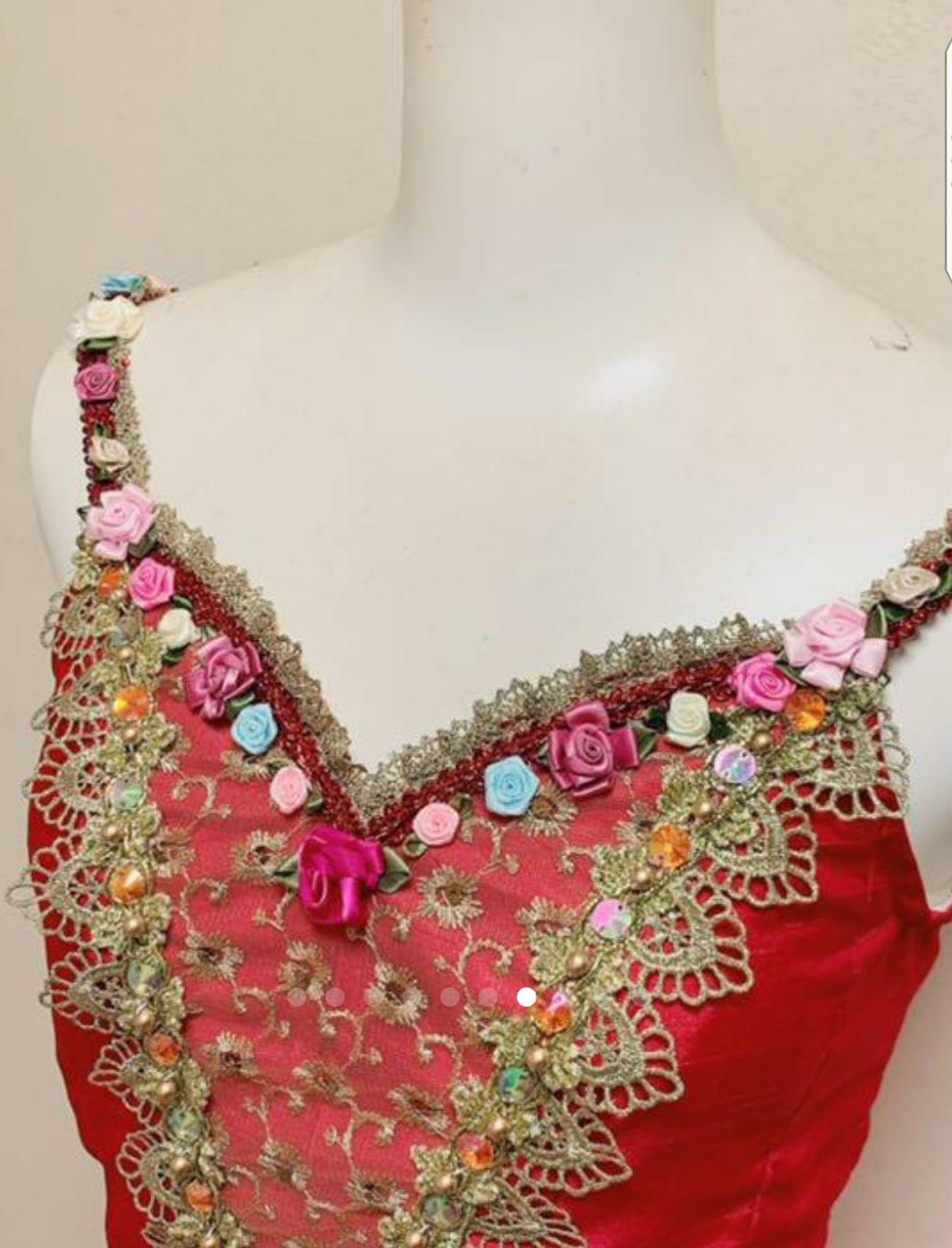 The red, silk taffetas fitted bodice features a very deep V inset decorated with gold trims and sequins, beads, tiny flowers, and sparkles.