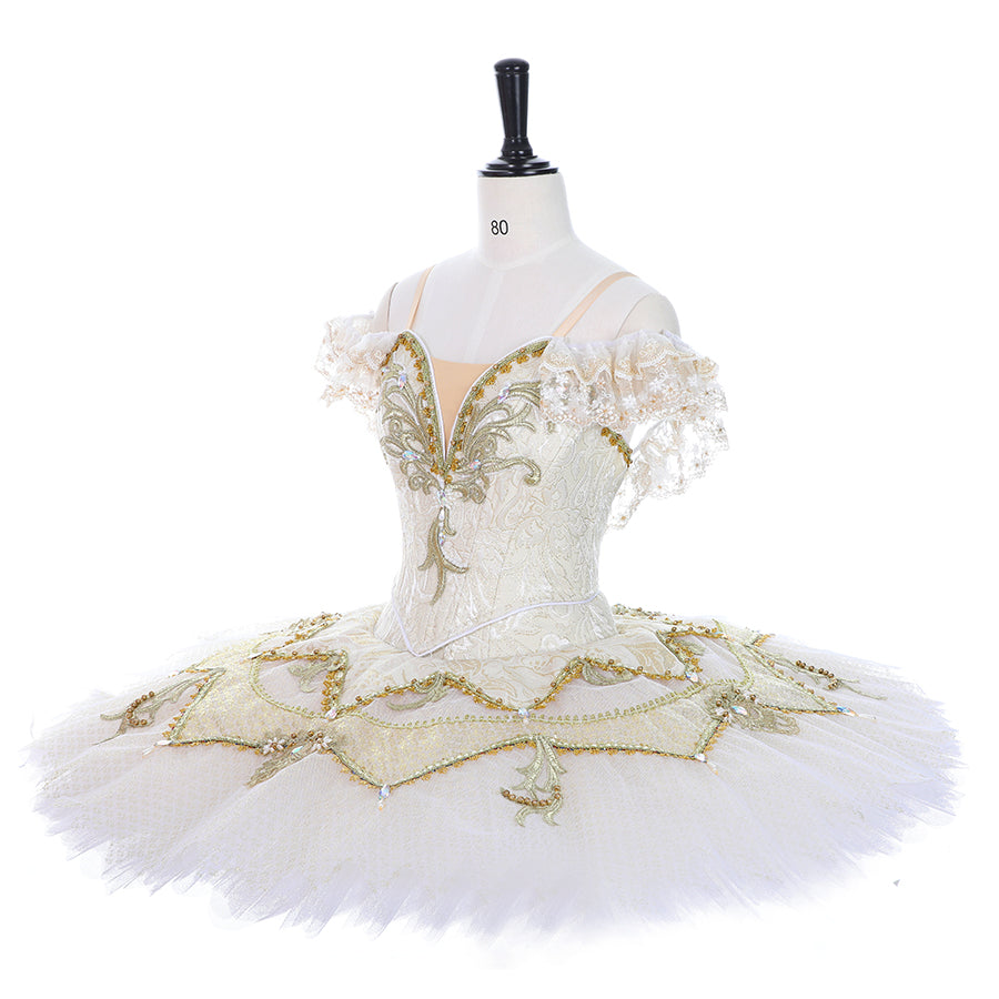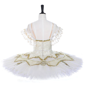 The white professional tutu skirt has a first layer presenting two different types of  brocade and golden trims. Gold appliques and crystals are also scattered all around the skirt.