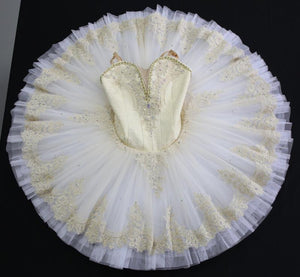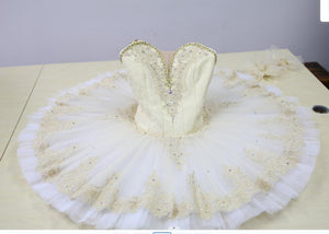 The bodice of this tutu is entirely made with pale gold brocade. The embellishments are nothing less than royal. We have used rich gold appliques all over the bodice, enhanced by crystals. The professional, 10 layers tutu skirt is white, decorated with gold appliques, lace and crystals.