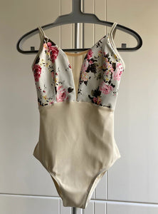 This professional leotard features a flattering deep v neck with nude mesh and spaghetti straps. The top part is made with printed lycra, while the remaining leotard features solid color.