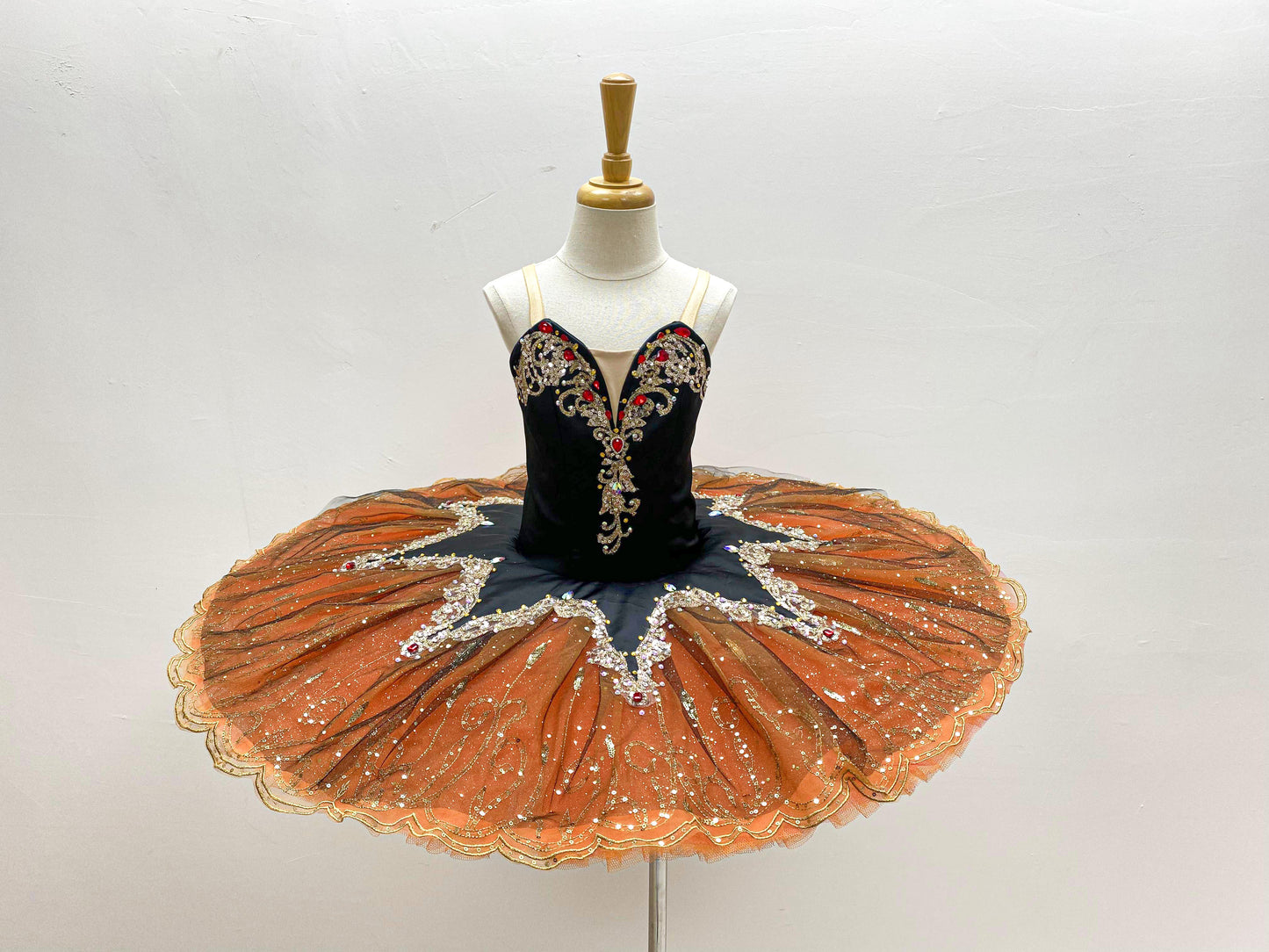 The professional 12 layers ballet skirt is golden brown. It features a star shaped, black tutu skirt, a glittery top layer made with bronze tulle,  gold appliques and sparkles.