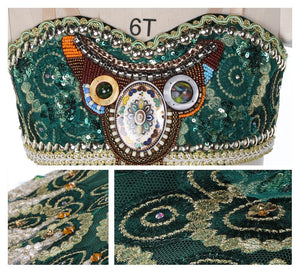 This dark green and gold professional odalisque tutu, has been created for the ballet La Bayadere and Le Corsaire. It is made in two pieces, featuring a short top and a tutu skirt.