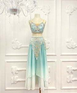 This two piece stage costume features an aqua green satin short top, decorated with shiny silver and white appliques, crystals and sparkles.