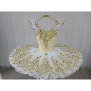 The professional, white platter tutu skirt is white, featuring 10 layers of hand pleated, high quality net. The first layer is entirely embroidered in gold, with lace appliques and crystals.