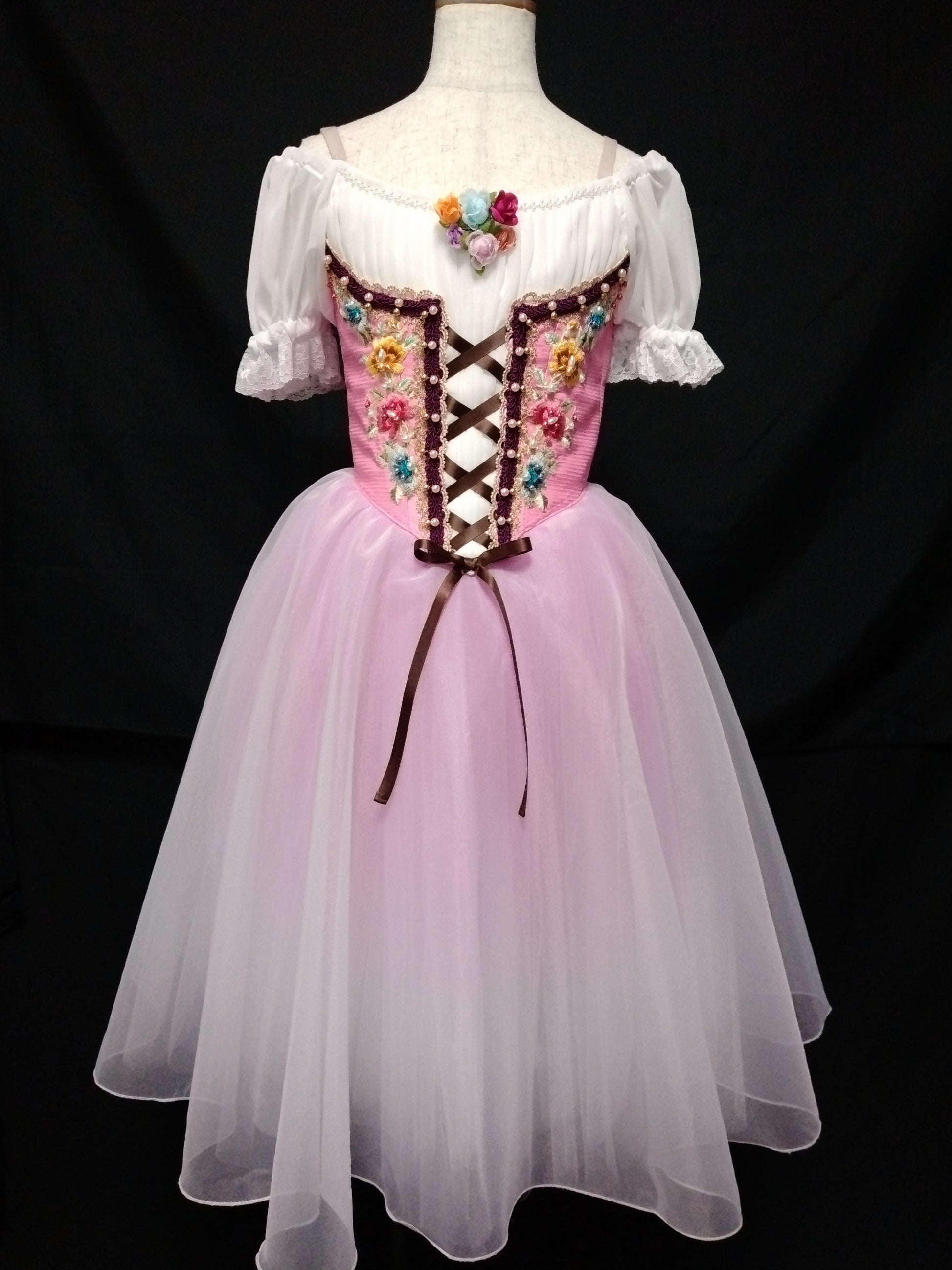 Unique professional stage costume, created by our Japanese designer. This Romantic tutu has been created for the ballet "la Fille Mal Gardee". It can also be used for ballets such as "Giselle", "Napoli", "La Vivandiere", "Napoli", "Flower Festival in Genzano", "Kermesse in Bruges" and many other ballets of the classical repertoire. This model is similar to the one used at the London's Royal Ballet for the role of Lisa in "La Fille Mal Gardee."