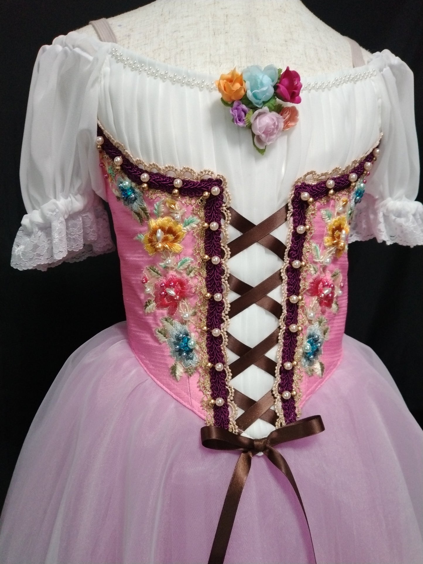 The bodice has been created using high quality pink fabric for the lower part, and white chiffon for the pleated undershirt. It features a darker crossed pattern in the front embellished with pink pearls, a round neck and puffy white short sleeves. Decorations on the pink part of the bodice have been made with beautiful flower appliques. A small bouquet of flowers decorates the upper chest. The bodice fastens at the back with a double row or hooks and eyes.