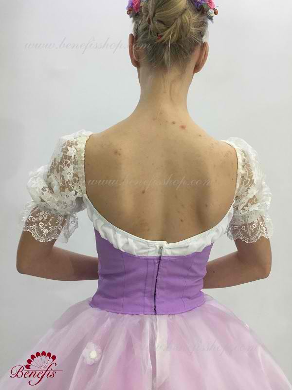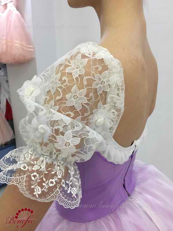 The bodice is made of the special semi-stretchy lilac fabric with a decorative lacing in front, plus flower decorations.
