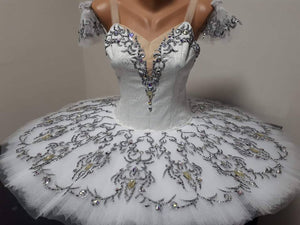 As white as the snow, this tutu feature a white and silver brocade bodice with clear straps, a deep nude insert, and the richest silver embellishments on the bodice made with silver shiny appliques, clear Swarovski crystals and stones. The 10 layers Russian pancake skirt is hand tacked and hooped, and the panties have ruffles.