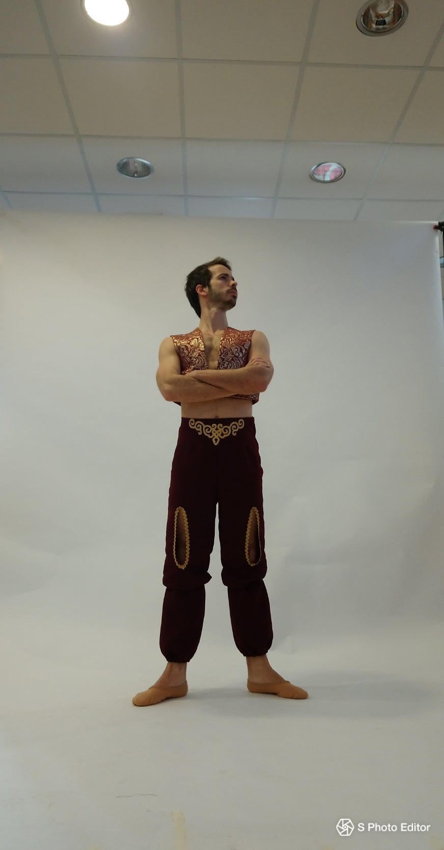 The short sleeveless jacket is made with gold and burgundy brocade. The burgundy pants feature the Oriental, slightly puffy style, while two front cuts decorated in gold are on the upper part of the pants. The waist is embellished with gold appliques.