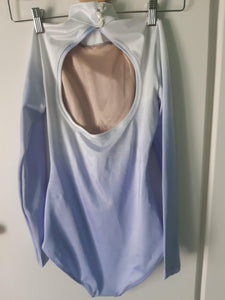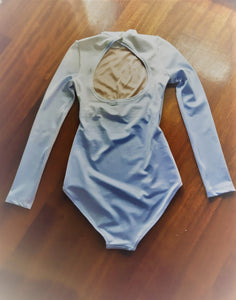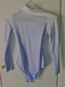Hand dyed with a wonderful shade of pale lilac, this leotard features mock neck, long sleeves and round opening in the back.