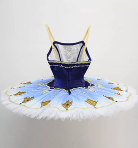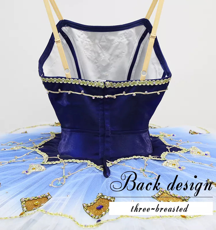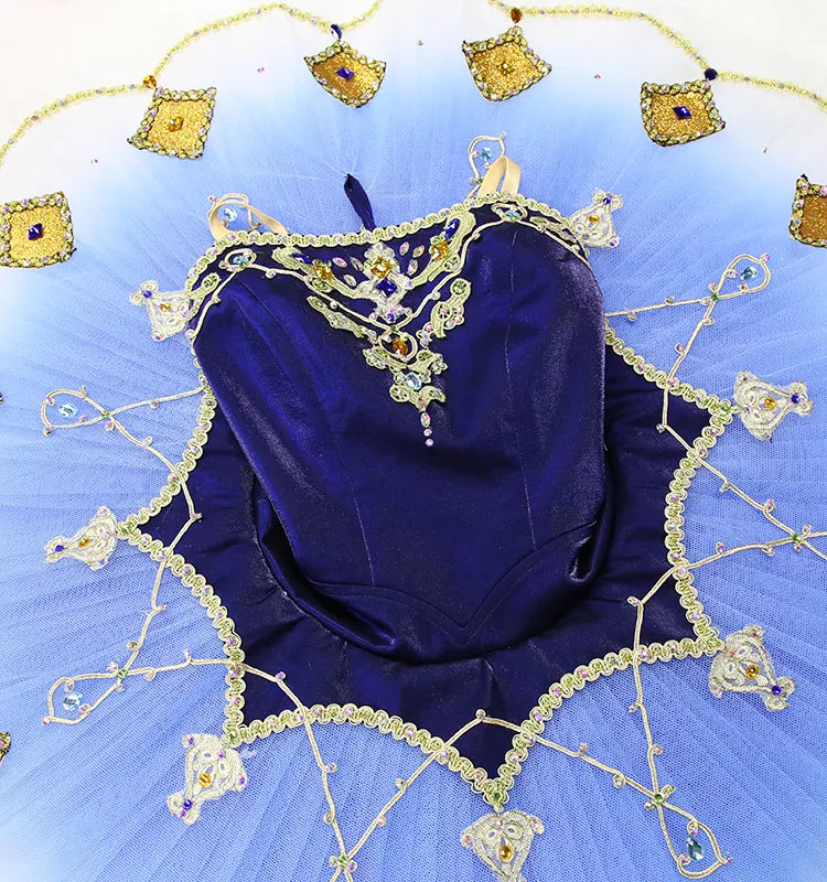 The professional 10 layers white skirt features the ombre' dying technique, with fading tones of sky blue.  The tutu skirt is decorated all around with golden appliques in geometrical shape, and with crystals.