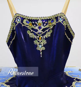 The bodice is created with dark blue velvet, and features a square neck. Embellishments were made using sparkling golden trims and appliques, as well as crystals.