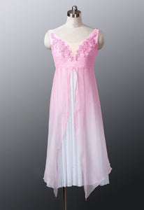 The whole dress is created using ombre' dyed chiffon, in gradient shades of blue. The upper part of this sleeveless dress, built on a V-shaped satin blue top. Deep V in the front with nude insert and hooks and eyes back closure. Decorations using silver appliques, beads, trims and sparkles.