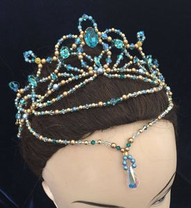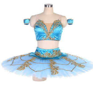 The basque of the tutu is made with the same fabric used for the top. It is embellished with golden braids, appliques, and gold stones. The tutu skirt is pale blue, and is entirely decorated with gold appliques and trims.