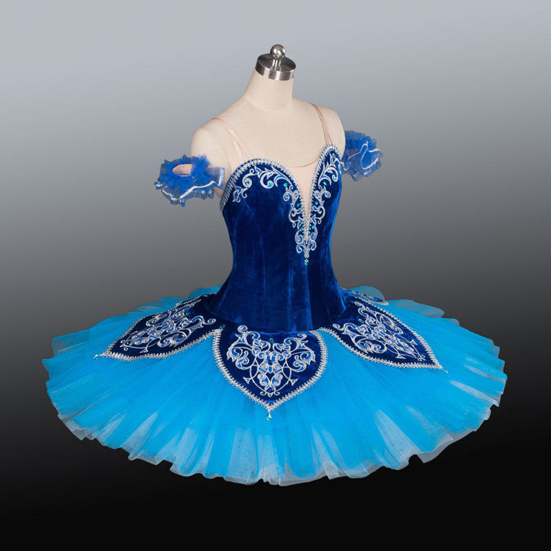 The professional, ten layers tutu skirt is pale blue with a deep blue top layer that creates a beautiful contrast.There is a flower-shaped tutu skirt. The flower's petals are made with the deep blue velvet used for the bodice, and they are decorated in silver, with trims and appliques.