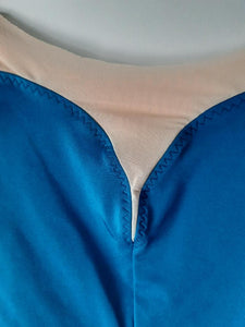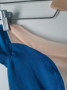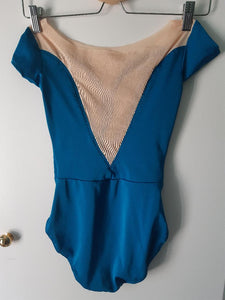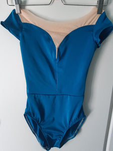 "Trish" is one of our latest leotards, in petrol blue. This elegant lycra leotard features a V neck with nude mesh insert, mesh short sleeves with matching lycra accents, and a deep V shaped mesh back.