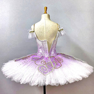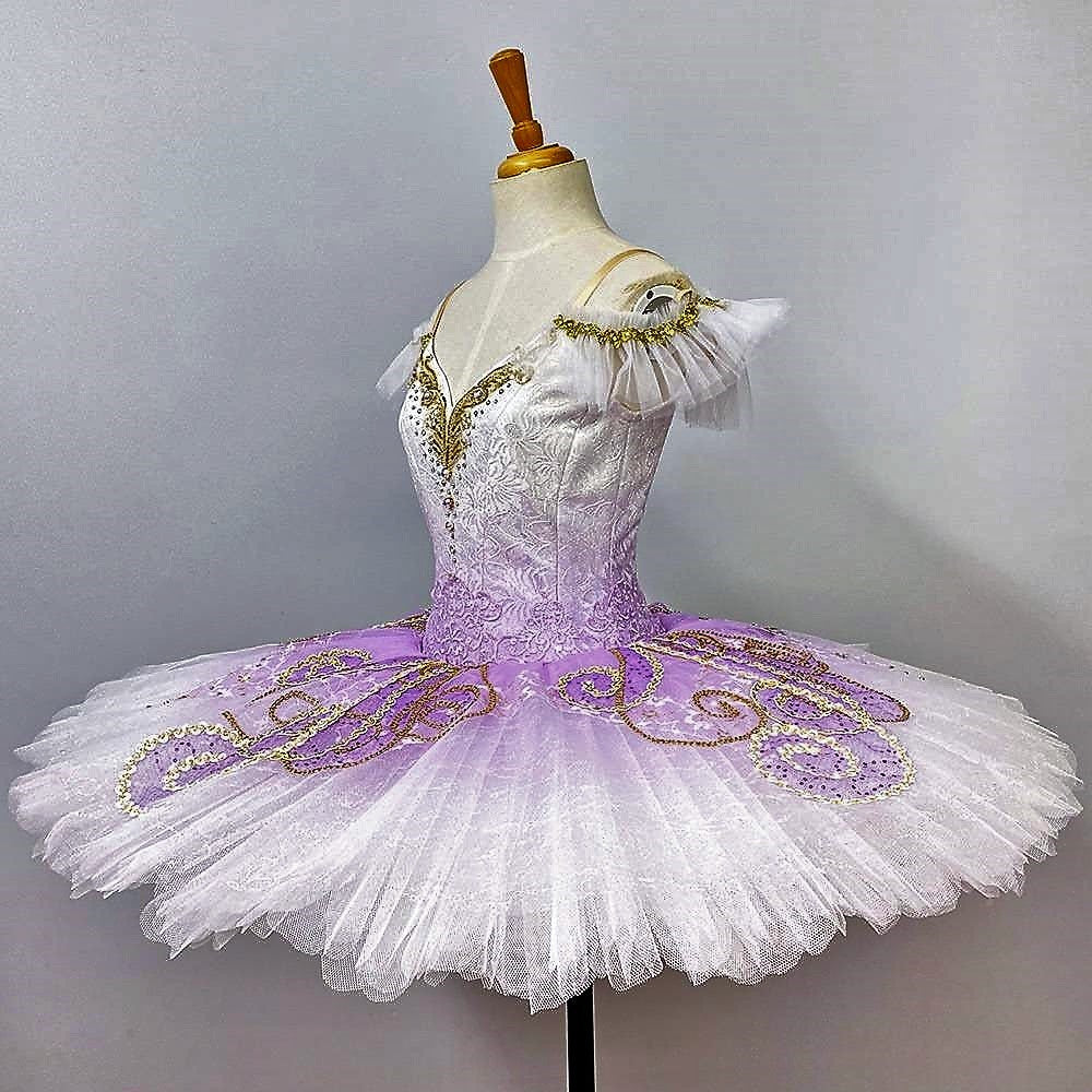 The professional, 10 layers tutu skirt is made with high quality, ombre' dyed lilac tulle, while the top layer is sparkling tulle. Decoration on the skirt was made using different shades of violet appliques, golden trims and crystals.