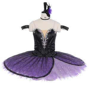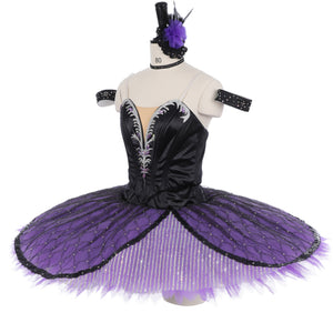 Enchanting back and violet Harlequinade professional tutu. This costume can also be used for the ballet Harlequinade. The top of this stage costume is made with black shiny satin and features elegant silver appliques. There is a black chocker, and a small matching hat, included with the costume.