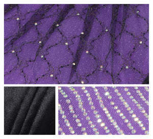 The professional, ten layers tutu skirt, is made with the finest lilac net, and features a top layer with silver sparkles, and a deep violet tutu overlay with black trims and white crystals.
