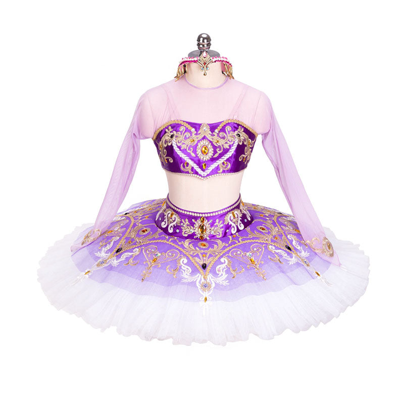 This professional, deep lilac, professional tutu, is made in two pieces to suit any oriental variation and solo. It features a short top in deep lilac shiny satin, very richly embellished with gold appliques and purple and gold beads. The professional, ten layers, tutu skirt is made with white tulle, embellished by a violet overlay, entirely decorated with gold appliques, and sparkles. The effect on stage is just mesmerizing!!! The costume's look is made even more elegant by the addition of lilac mesh long sleeves and neck area.
