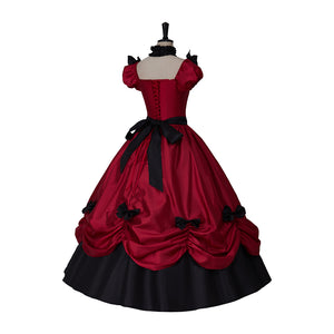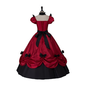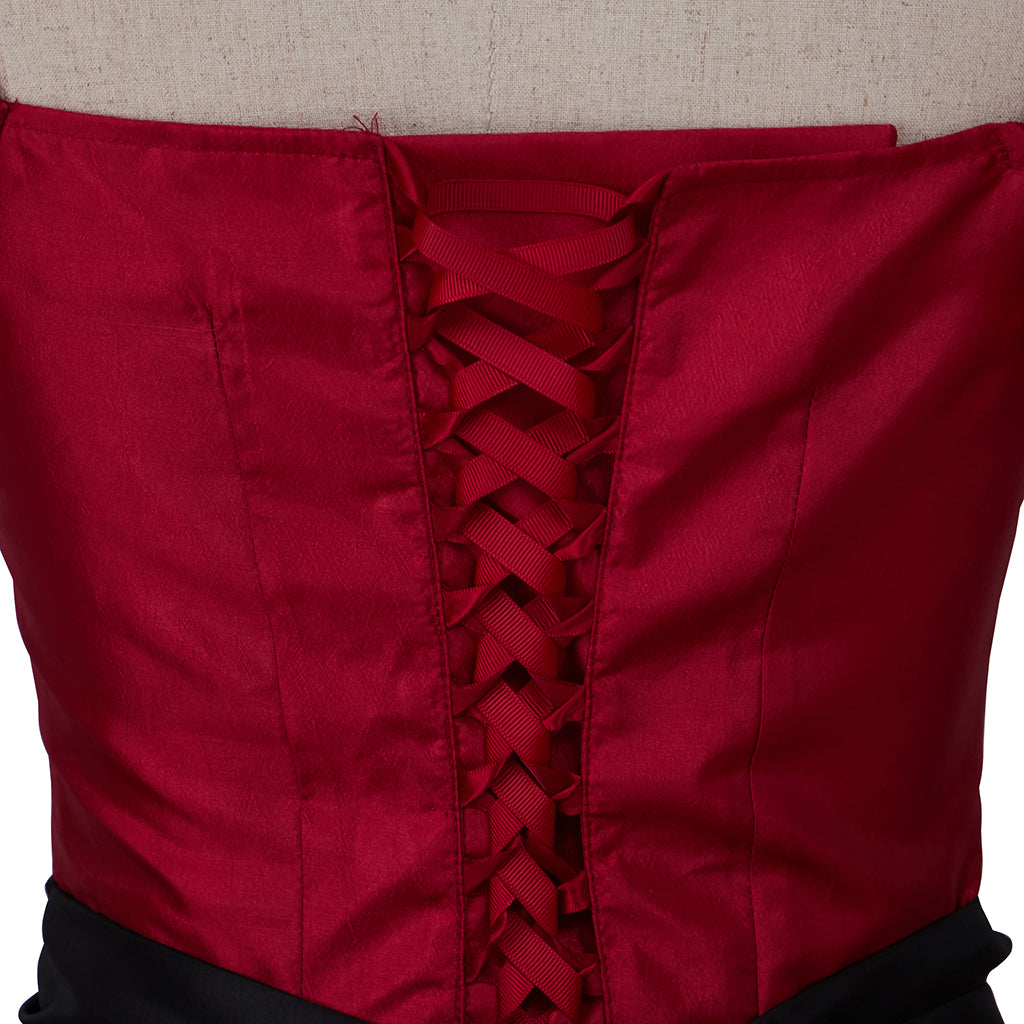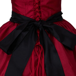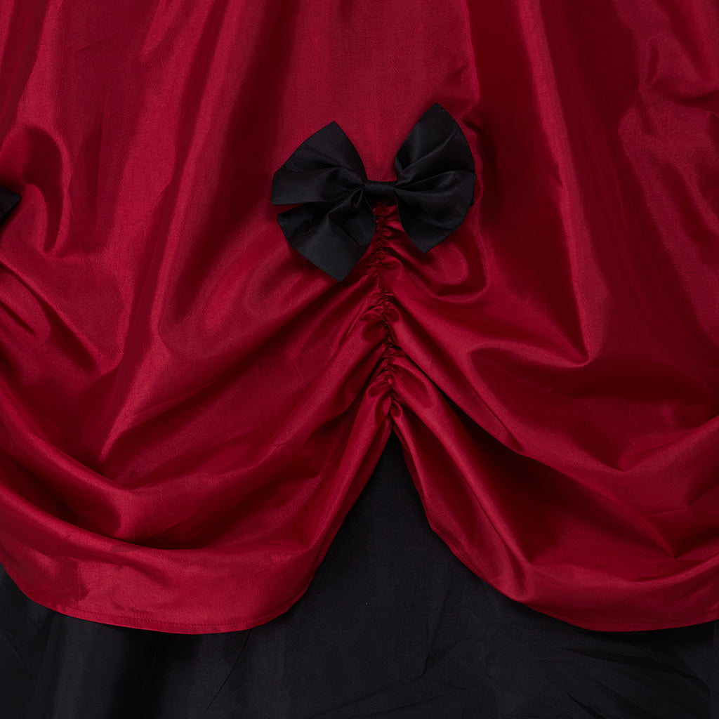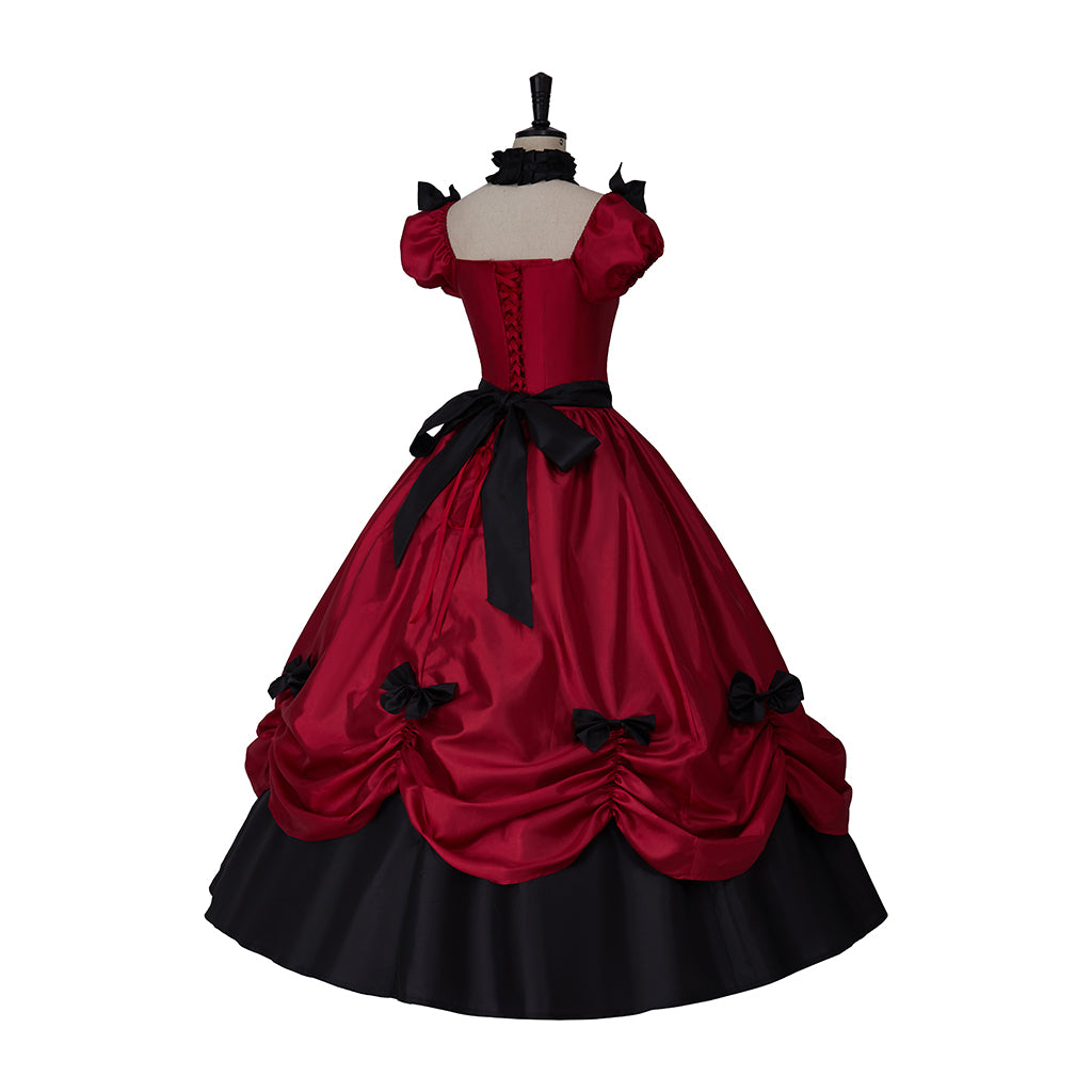 Sweetheart neck, short sleeves, black sash on the waist and decoration with black bows. Black underneath layer.