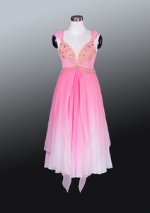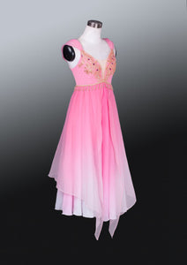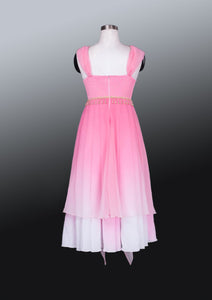 We have used pink chiffon that fades to white and white chiffon. The top part of this dress features a deep V in the front and a nude inset. The embellishments are made using gold appliques, pearls and sequins. Wide chiffon strap made according to the oriental style. The skirt has three layers and the top layer is shorter than the other ones and cut diagonally,