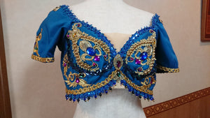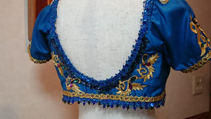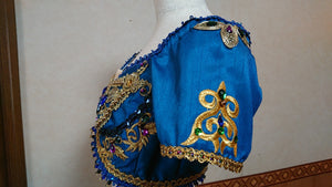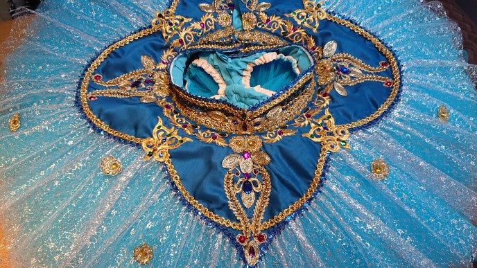The short deep blue top is made with brocade fabric and richly emellished with gold appliques and trims, white and Svarowski crystals. The ombre turquoise tutu skirt is more than poetry! The belt is made with the same fabric used for the bodice, and is decorated with gold trim and a big crystal in the middle. Further down, there is a small tutu skirt created with pale blue satin and organza, in a petal-like pattern. Here we ahve used different types of golden trims and appliques, and various crystals. The skirt has been dyed with different shades of blue and turquoise, for a phenomenal stage effect.