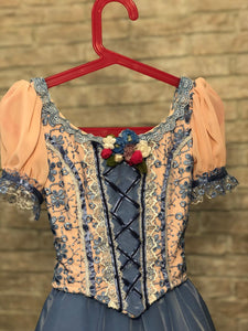 Romantic, peasant style Russian tutu for the role of Coppelia or La Fille Mal Gardee. Blue and pink bodice with laced pattern and short, decorated sleeves. Flower appliques on the bodice.