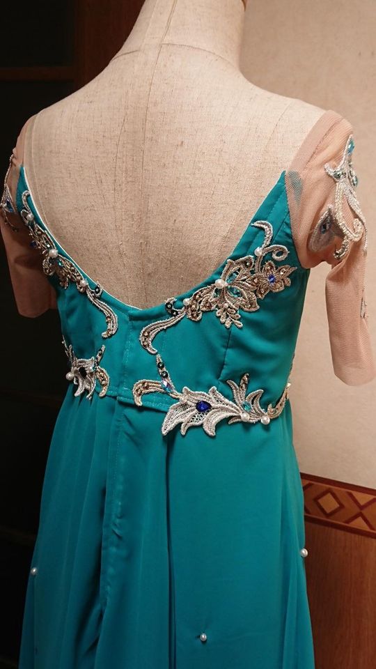 This chiffon dress shows an empire wais and V shaped neck. The top part of the dress is richly decorated with silver appliques and blue crystals. There are nude mesh short sleeves, also decorated with silver appliques and blue stones. The back of the dress is also V shaped, and the costume fastens in th back with a double row of hooks and eyes.
