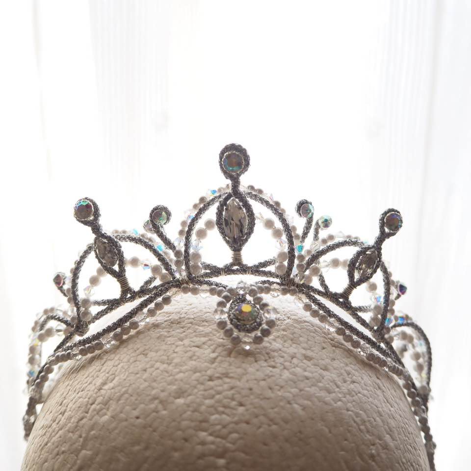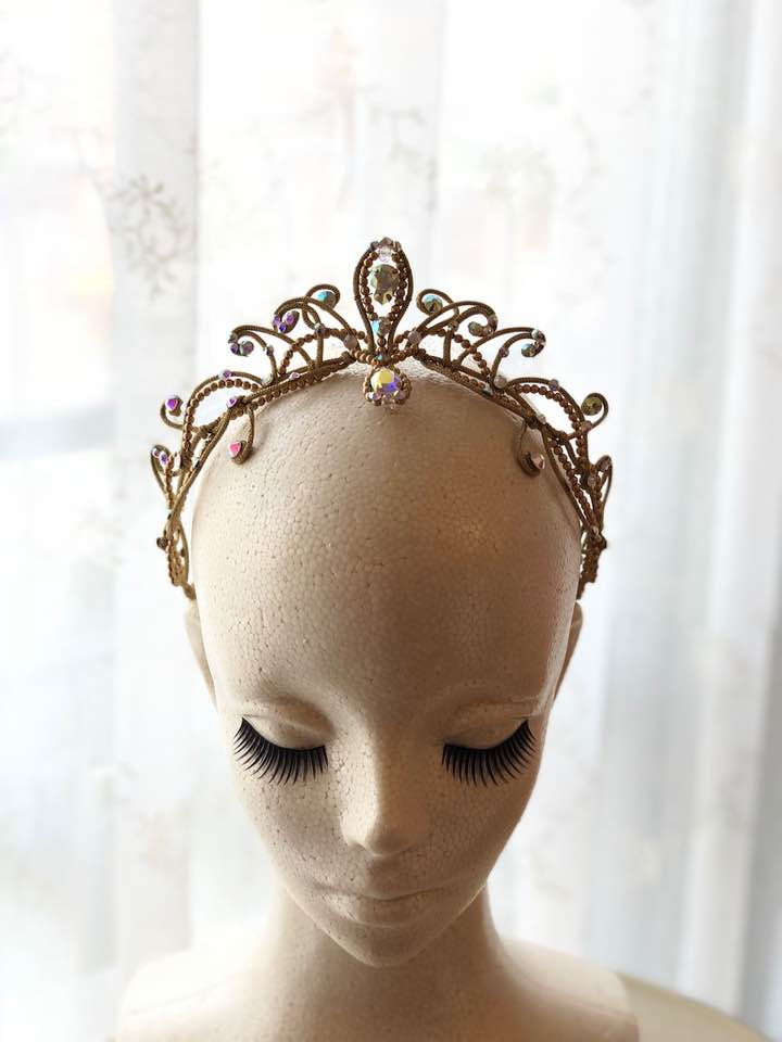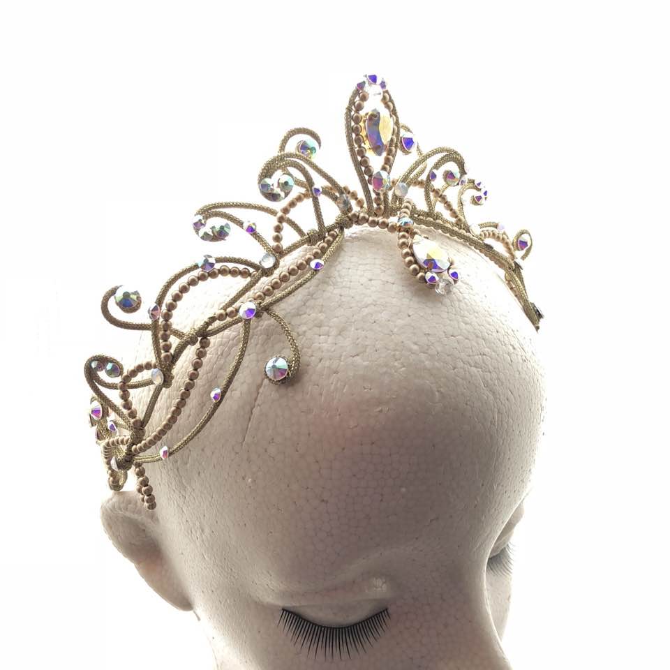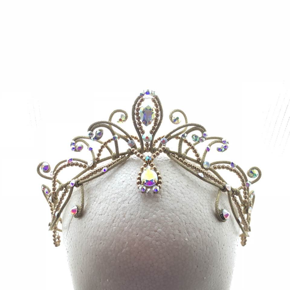 A crown-type tiara made with gold pearls and red Swarovski crystals, inspired by Gamzatti from Bayadere. This professional crown features red Swarovski crystals in different shapes and sizes, as well as golden beads. An amazing piece, only available at Dancewear by Patricia.