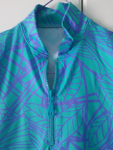 Made with high quality lycra with a marble pattern in aqua green and violet (just like th water of Miami Bach!!), this leotard features a pretty lilac front zipper.